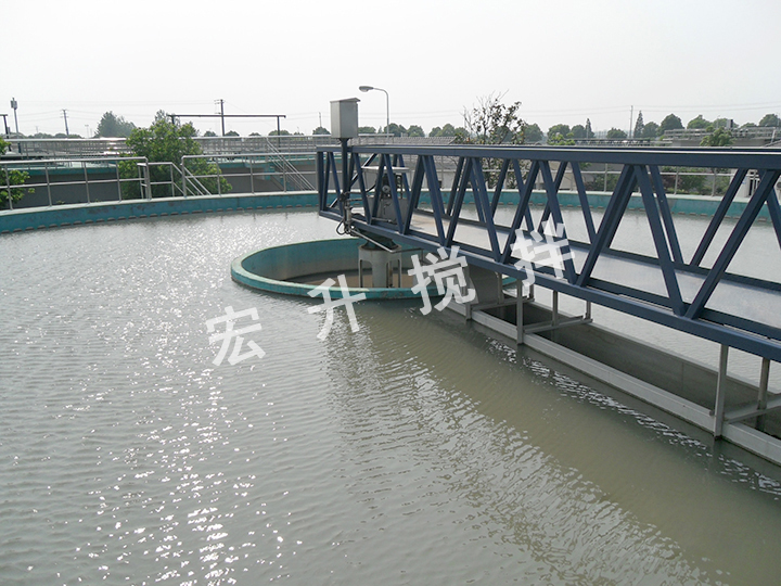待處理的水從中心筒進(jìn)水管進(jìn)入,通過穩(wěn)流筒穩(wěn)流進(jìn)入沉淀池然后向四周擴(kuò)散沉淀,清水由池邊溢流堰流出,其中沉淀物由刮泥板集中到刮泥口,經(jīng)壓縮空氣擾動(dòng)混合和增加氧,增加了污泥活性,根據(jù)連通管原理,利用水位差將池底污泥刮入排泥槽,通過虹刮管進(jìn)入中心筒排泥管排出。同時(shí)池中浮渣由刮板收集經(jīng)排渣斗排出池外。