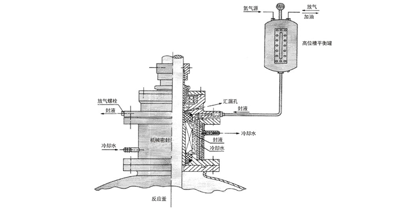 (2)該裝置多在負壓情況下配用,也可用在正壓工況,負壓時高位槽可不用通氣源,正壓時高位槽接通氣源,調整好壓力使高位糟及密封腔壓力與釜內壓力處于相等或高于釜內工作壓力0.05-0.1MPa為好。